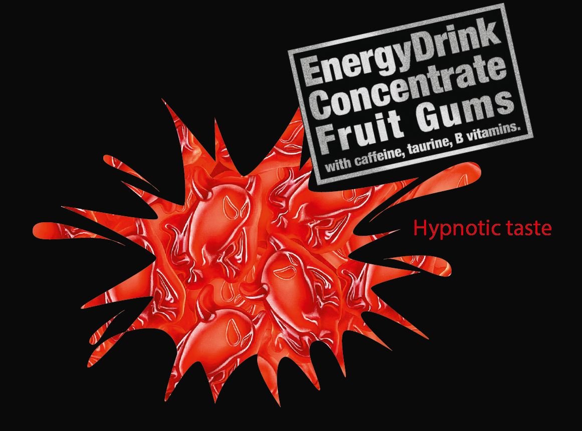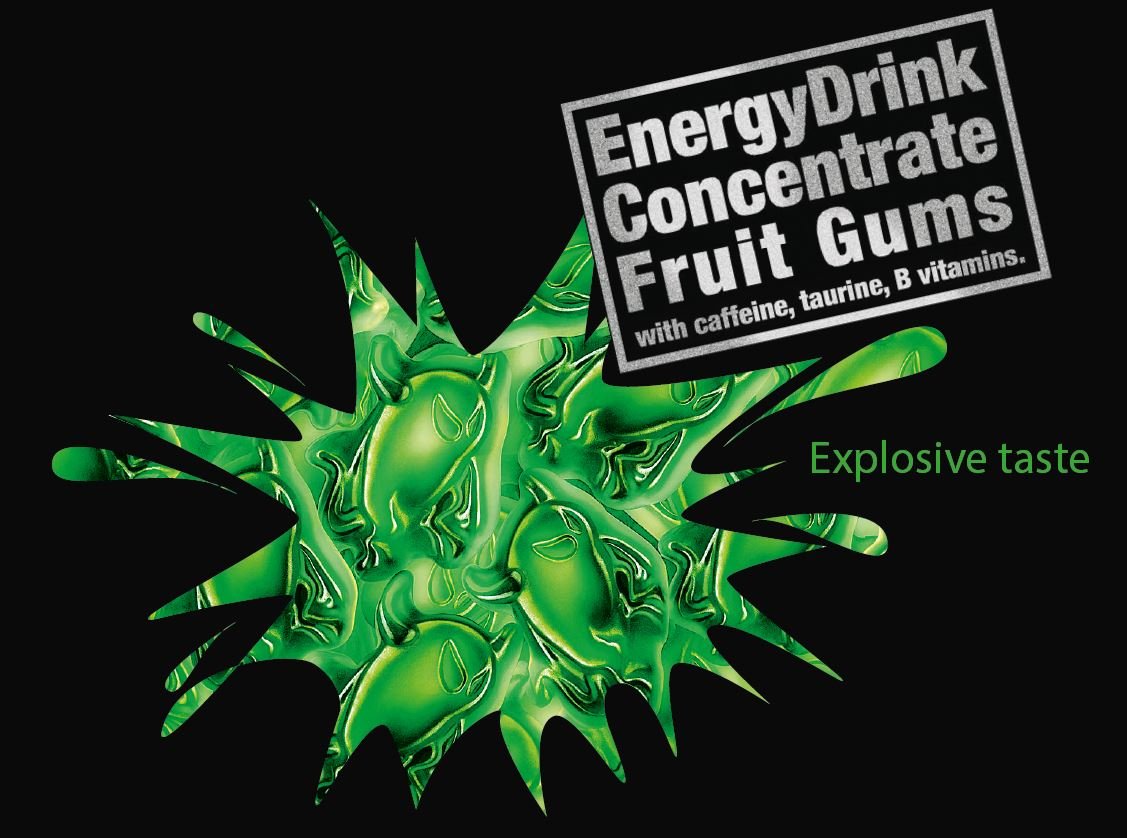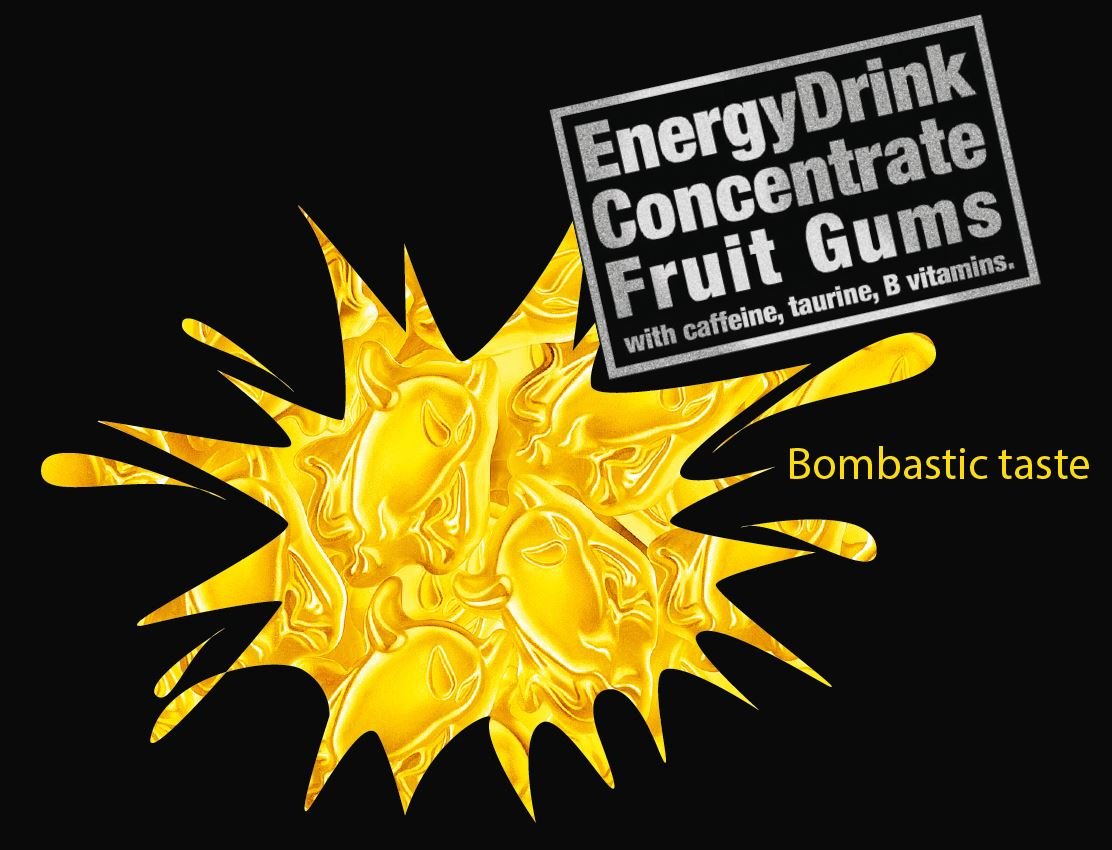 Every bite into EnergySweeties promises a unique and delighting taste experience. Made from energy drink concentrate this exciting creation combines original energy taste and concentrated power of caffeine, taurine and B vitamines. We call it the yummy & boom punsch.